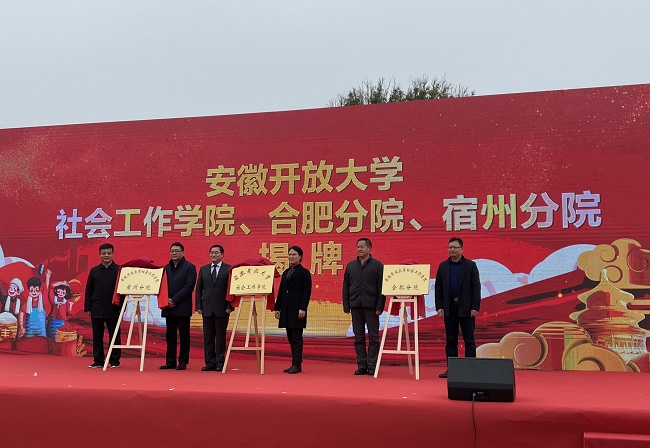 3月16日上午,在安徽省暨合肥市2021年社会工作主题宣传周启动仪式上,安徽省民政厅党组成员、副厅长许静静,安徽开放大学党委委员、副校长诸咸斌共同为安徽开放大学社会工作学院揭牌。合肥分院、宿州分院同时揭牌。
