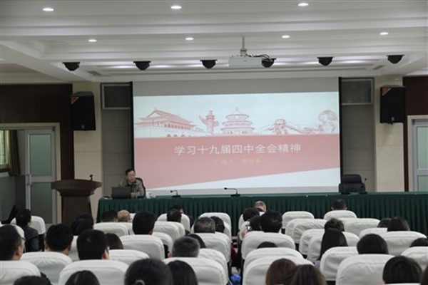 党委书记刘义在讲话中强调,党的十九届四中全会是我国发展建设关键时期召开的一次关键会议,具有重大而深远的意义。学校要把学习宣传贯彻好党的十九届四中全会精神作为当前和今后一个时期的重要政治任务,坚持和完善中国特色社会主义现代大学制度,推进学校治理水平和治理能力现代化。一是必须坚持和加强党的全面领导,维护党中央权威和集中统一领导,更好地理解国家大政方针。要把党的领导落实到学校的各方面各环节,建立健全党对重大工作的领导体制机制,提高领导干部的执政能力和执政水平,推进全面从严治党。二是必须发展社会主义的民主政治,坚持人民主体地位,坚定不移走中国特色社会主义政治发展道路。要凸显教职工的主体地位,依靠师生,进一步完善教代会制度。三是必须提高依法办学、依法行政的能力,强化依法行政意识,加强制度建设。学校要全面贯彻党的教育方针,守正创新、提质进位,努力推进学校事业在新时代实现高质量发展。