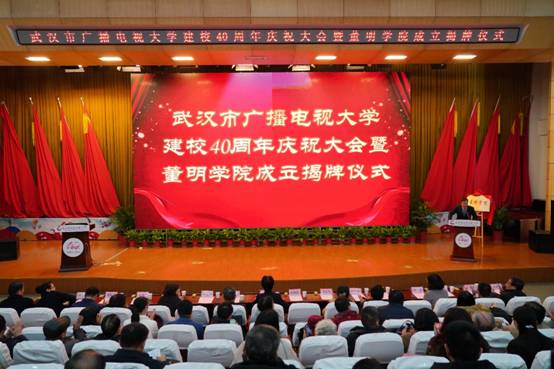 武汉分部建校40周年庆祝大会暨董明学院成立揭牌仪式举行。国家开放大学党委副书记、纪委书记刘向虹,武汉市人大常委会副主任胡树华,武汉市原副市长、武汉市人大原副主任、学校老校长高顺龄,共青团湖北省委副书记王云清,湖北省教育厅职成教处副处长刘长军,武汉市总工会党组书记、常务副主席王芳,共青团武汉市委副书记叶仁杰等出席会议。
