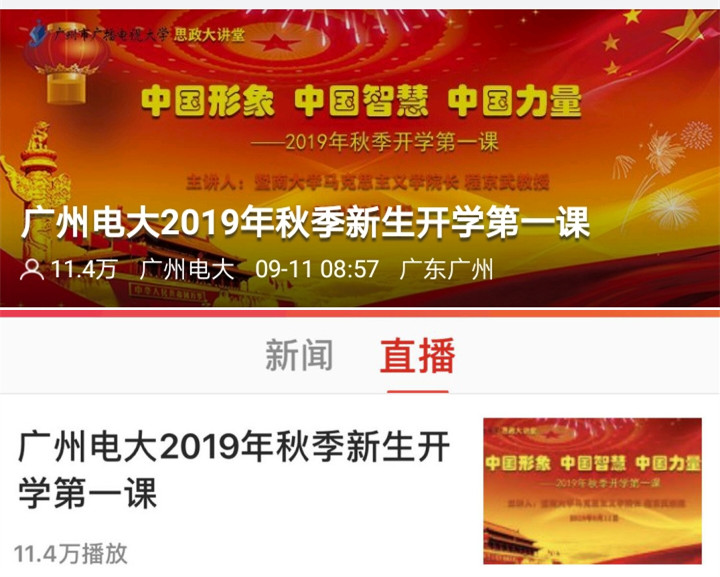 9月11日,广州电大邀请暨南大学马克思主义学院院长程京武教授为2019年秋季新生主讲“中国形象 中国智慧 中国力量”的开学第一课,此课也是“广州电大思政大讲堂”活动新学期第一讲。校本部400多名新生代表在麓湖校区礼堂聆听精彩的讲座,全系统三万多名新生通过触电新闻平台提供的实时直播进行收看,当天共有11.4万人次在平台上收看此课程。
