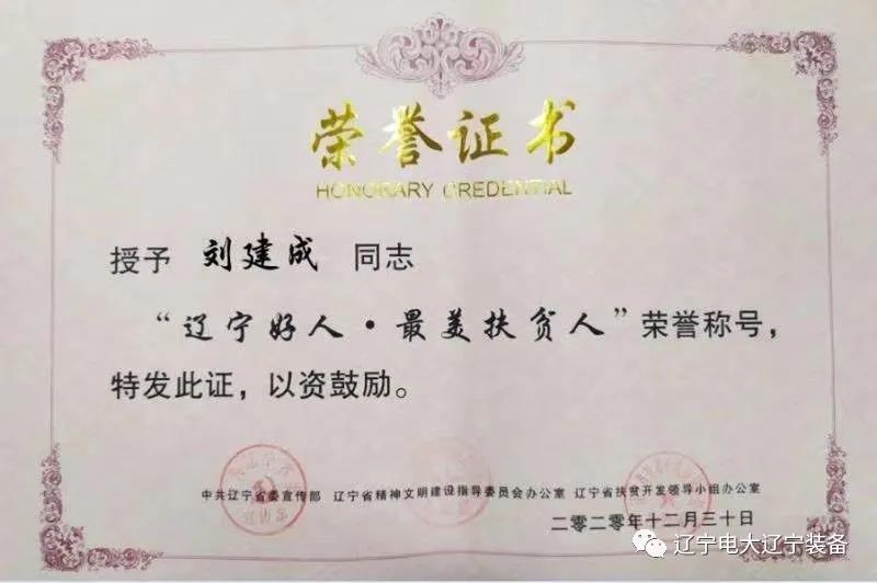 近日,中共辽宁省委宣传部、辽宁省精神文明办公室、辽宁省扶贫办公室授予辽宁省10名同志“辽宁好人·最美扶贫人”称号,辽宁开放大学刘建成同志获此殊荣。