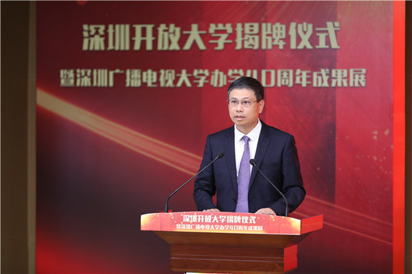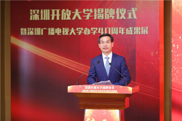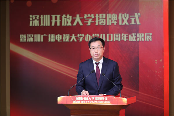 3月20日,深圳开放大学揭牌仪式暨深圳广播电视大学办学40周年成果展举行。深圳市委常委、宣传部部长王强,深圳市人民政府党组成员、副市长聂新平,国家开放大学党委书记、校长荆德刚,市委教育工委书记、市教育局党组书记、局长陈秋明,国家开放大学副校长林宇等出席活动并为深圳开放大学揭牌。
