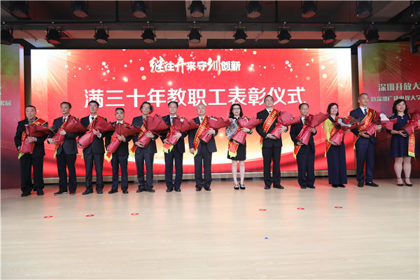 在本次活动中,一批杰出校友和在学校工作满三十年的教职工受到表彰。杰出校友代表、全国道德模范董明作了发言。仪式上正式启动了“深i学”全民终身学习平台。