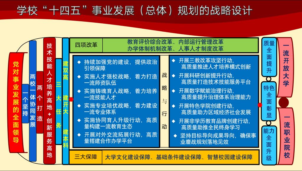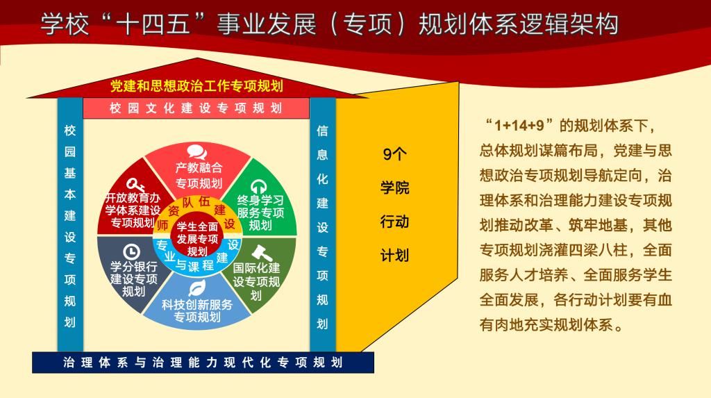 为确保“十四五”事业发展规划落细落地,学校构建了“1个总规+14个专项规划+9个二级学院行动计划”的规划体系,高质量打造事业发展目标链、标准链。“十四五”期间,学校将按照高质量发展工作布局,重点推进党建和思想政治工作、师资队伍建设、专业与课程建设、学生全面发展、校园文化建设、校园基本建设、治理体系与治理能力建设、信息化建设、产教融合、开放教育办学体系建设、终身学习服务、国际化建设、科技创新服务、学分银行建设等14个专项规划,全力实施9个二级学院行动计划,以学校“十四五”期间主要发展指标任务为抓手,推动“互联网+”办学特色鲜明的新型大学建设进入发展快车道。