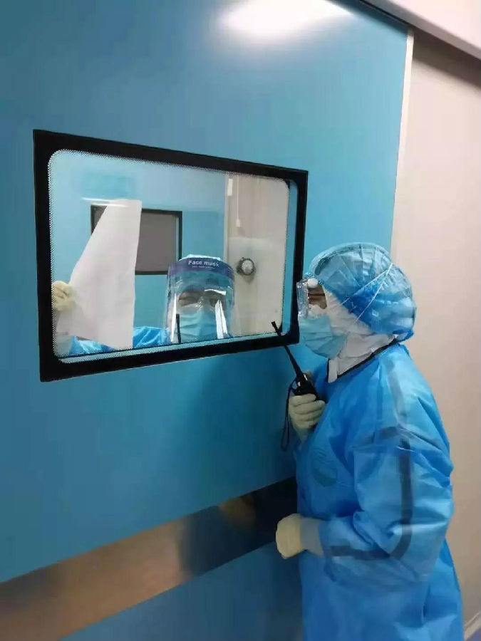 工作期间,为了减少感染风险,长发护士们把留了多年的长发剪短。进入隔离病房后,虽然只有一道门,但是医护人员为了节省防护服等医疗物品,减少进出隔离病房的次数,用对讲机沟通、交流工作相关事项。