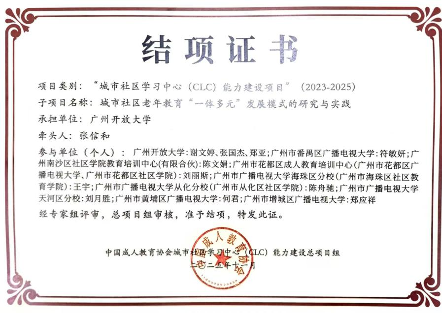 广州开放大学将继续深化城市社区老年教育“一体多元”发展模式的研究与实践,进一步推动老年教育向普惠化、可及化、智能化、融合化方向发展,助力构建“老有所学、老有所乐、老有所为”的老年友好型学习型城市。
