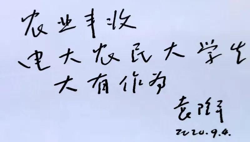 2020年9月,长沙广播电视大学举办“2020中国农民丰收节(长沙)暨第二届长沙农民大学生创新创业节”,袁老再次为该活动题词鼓励:农业丰收,电大农民大学生大有作为!