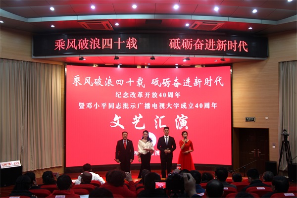 2018年12月29日,学校举办庆祝改革开放40周年暨邓小平同志批示广播电视大学成立40周年文艺汇演。汇演以“乘风破浪四十载 砥砺奋进新时代”为主题,将学校辉煌奋斗历程和校友、师生对学校的祝福,汇聚成“梦想篇:希望的田野”“改革篇:春天的故事”“创业篇:奋进的号角”3个篇章,精彩纷呈,高潮迭起,展现了电大人奋发有为的精神面貌和蓬勃向上的气宇风采。汇演上还发布了全省电大“2018年度十大新作为 新气象”。
