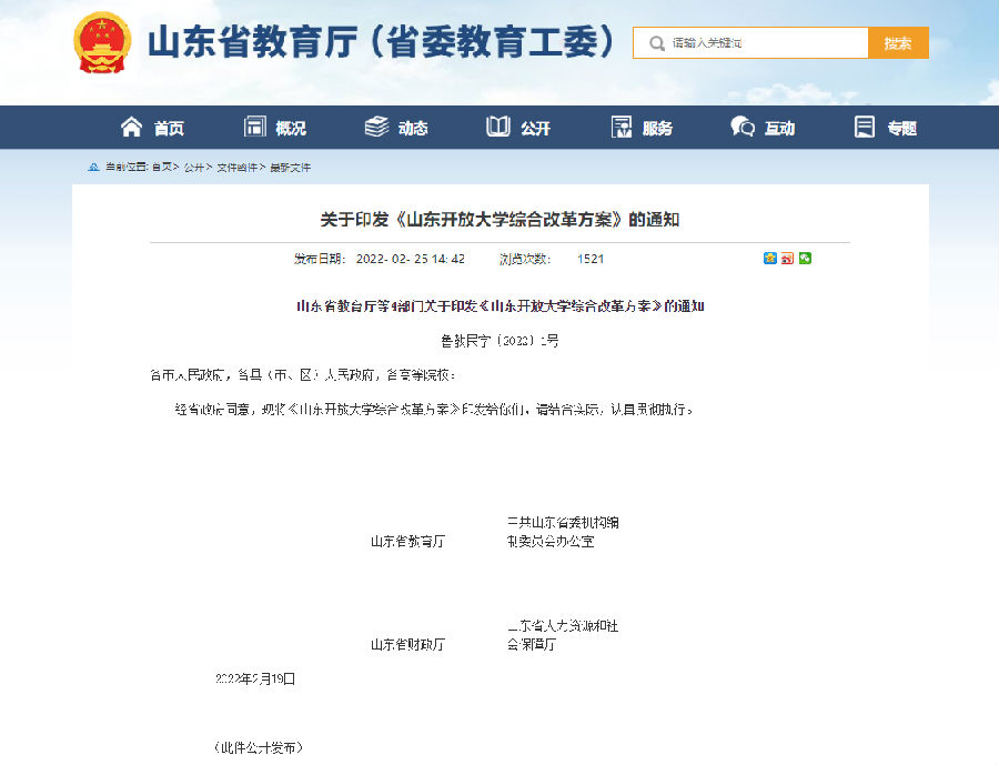 2月25日,记者从山东省教育厅获悉,经山东省人民政府同意,山东省教育厅等4部门联合印发了《山东开放大学综合改革方案》(以下简称《方案》)。