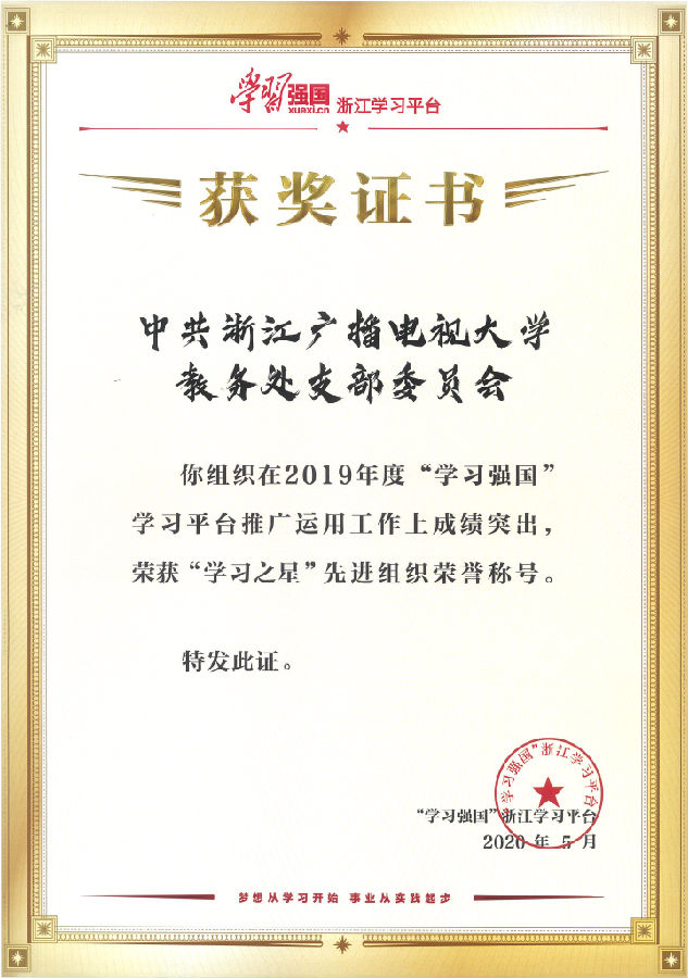 5月18日上午,浙江省“学习强国”平台学习交流暨2019年度学习之星授奖活动在杭州举行,浙江分部教务处党支部获“学习之星”先进组织荣誉称号。