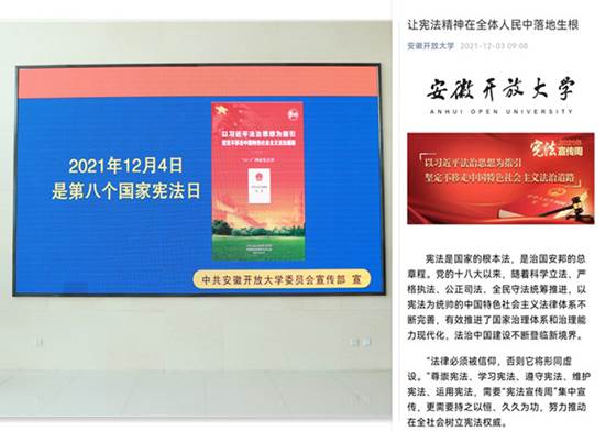 活动期间,安徽开放大学通过校园网、电子显示屏、微信等多种方式,开展宪法宣传活动,大力弘扬宪法和法治精神,着力培育学习宪法、尊崇宪法的校园法治文化,提升宪法教育的影响力和感染力,努力营造宪法学习宣传的良好氛围。