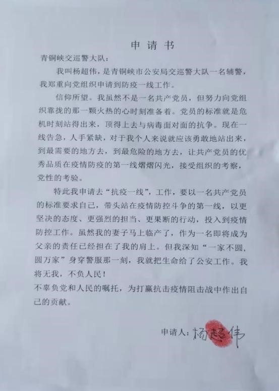 青铜峡电大分校2019年春季法学专科学员杨超伟,在校期间成绩优异,是青铜峡交巡警大队辅警。2020年新冠肺炎疫情暴发后,他主动请缨前往青铜峡马长滩防疫卡点。10月21日,青铜峡市发生疫情后,他顾不上马上临产的妻子,极力要求前往抗疫第一线,全副武装对接防控工作。面对辛苦的工作,面对同事的疑问,他说“我想见到孩子,但穿上这身警服,就是要在关键时候不掉队。陪护一个人固然重要,但守护保护万家是我的职责。”