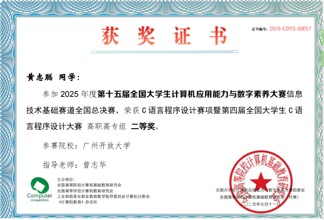在近日落幕的第15届全国大学生计算机应用能力与数字素养大赛信息技术基础赛道全国总决赛中,广州开放大学乡村振兴学院黄志聪同学表现优异,荣获C语言程序设计赛项暨第四届全国大学生C语言程序设计大赛高职高专组二等奖。该赛事由全国高等院校计算机基础教育研究会主办,是国内计算机领域具有重要影响力的专业赛事,吸引了全国众多高校的优秀学子参与角逐。在教学中心曾志华老师的专业指导下,黄志聪同学凭借扎实的编程基础和出色的临场发挥,经过激烈竞争最终脱颖而出。这一成绩充分展现了广州开放大学学子的专业素养和实践能力。