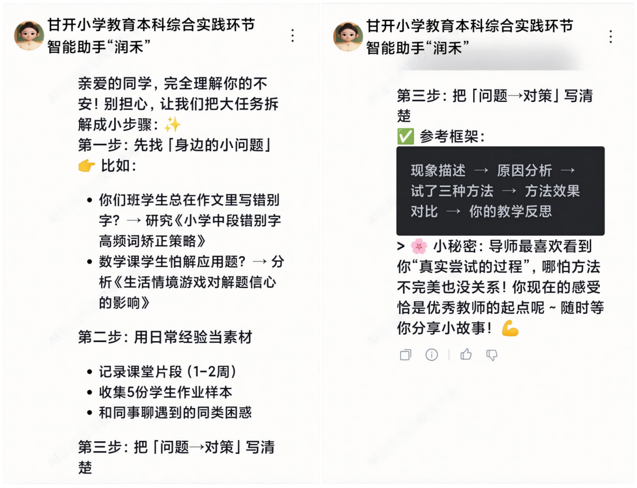 该智能体围绕“培养善教学、能研究、会反思的高素质小学教师”专业培养目标,构建了四大核心功能模块。其中,流程规范模块贯通实习备课到论文答辩全流程;选题指导模块提供涵盖教学设计、班级管理、学生发展等方向的数百个实践课题;写作支持模块强化案例撰写、教学反思与研究表达能力;成长引导模块着重培育师范生的职业认同与教育情怀。