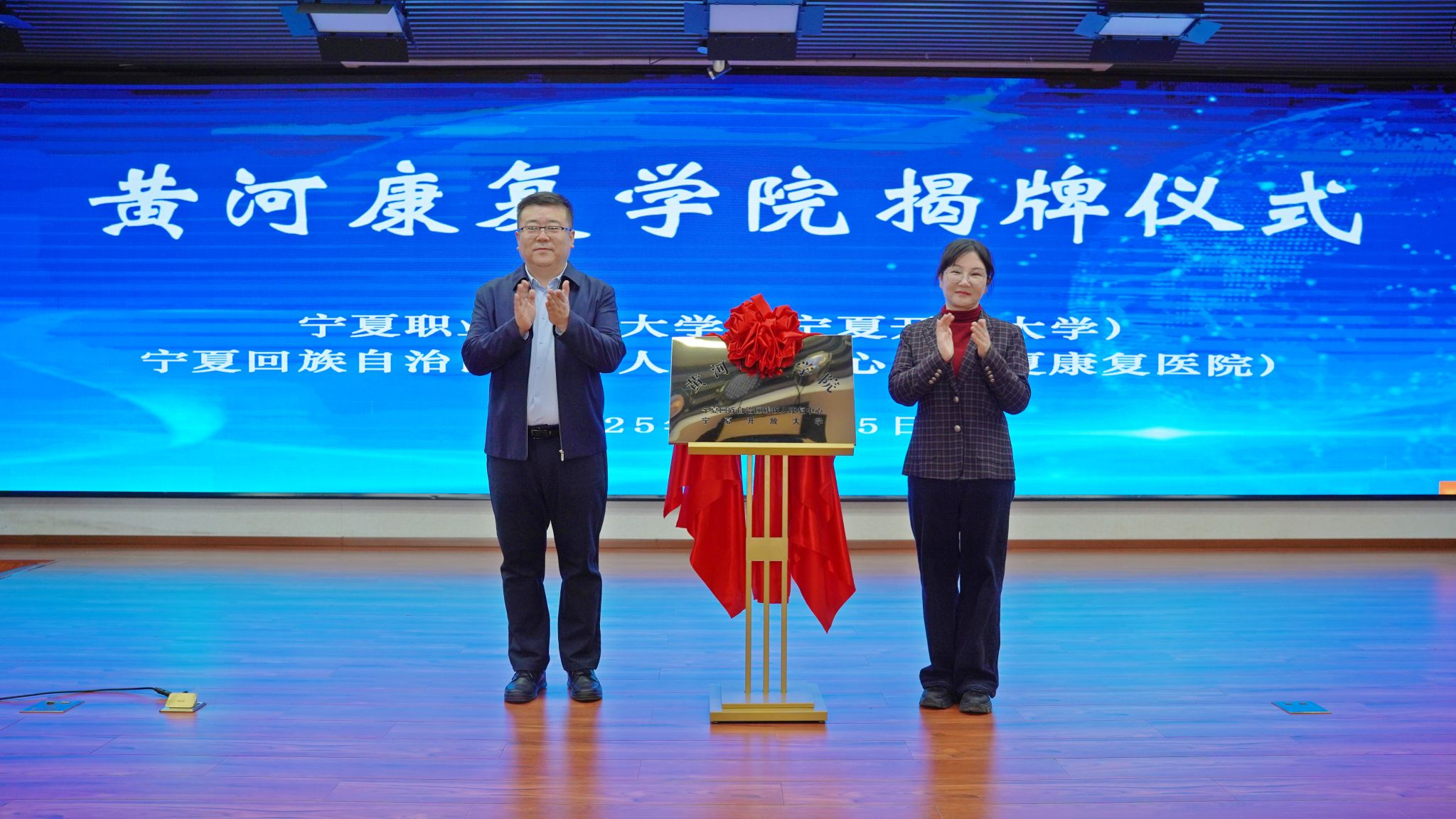 宁夏分部副校长陈灿、自治区残联副理事长吴秉凯为“黄河康复学院”揭牌