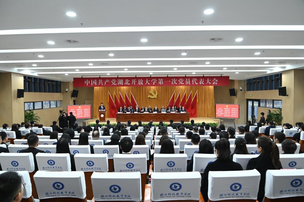 报告厅内气氛庄严热烈。主席台上方悬挂着“中国共产党湖北开放大学第一次党员代表大会”的会标,后幕正中是镰刀和锤头组成的党徽,10面鲜艳的红旗分列两侧,会场后方悬挂着“深化改革创新 加快融合发展 奋力谱写特色鲜明优势突出新型大学建设新篇章”的横幅。学校124名正式党员,48名列席人员8名特邀嘉宾参加大会。