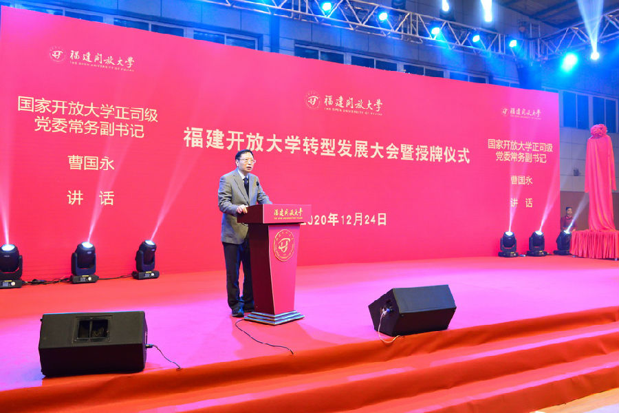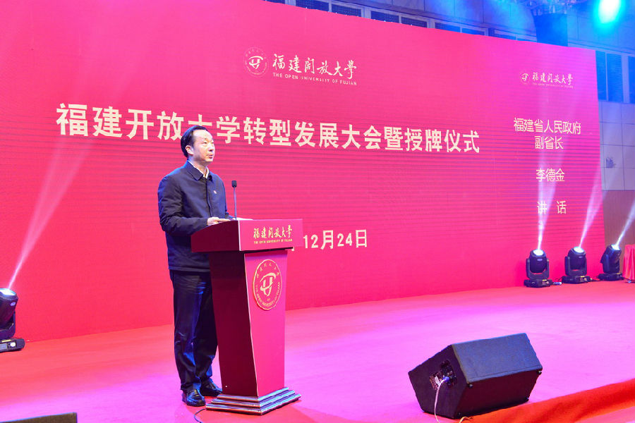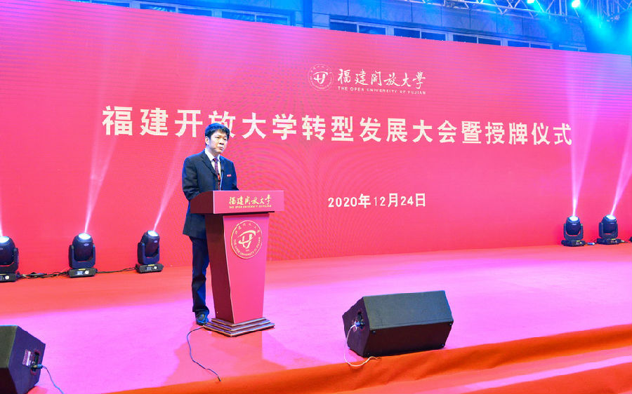 2020年12月24日,福建开放大学转型发展大会暨授牌仪式在福建开放大学桂山校区举行。福建省人民政府副省长李德金,国家开放大学党委常务副书记曹国永、副校长李林曙,福建省人民政府副秘书长赖碧涛,福建省委教育工委副书记、省教育厅党组成员、一级巡视员王建南出席大会暨授牌仪式。授牌仪式由党委副书记、校长吴国荣主持。