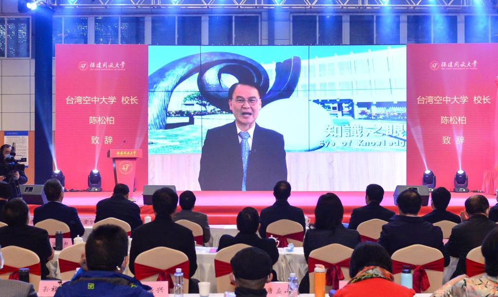 台湾空中大学校长陈松柏通过视频致辞,表达了对学校更名转型的祝福。