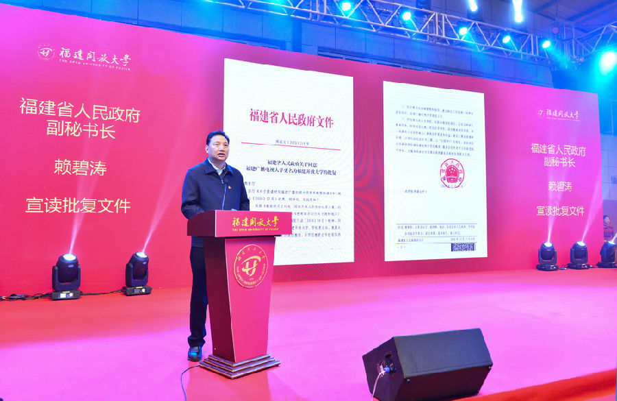 赖碧涛宣读了《福建省人民政府关于同意福建广播电视大学更名为福建开放大学的批复》,标志着学校翻开了发展史上崭新的一页。