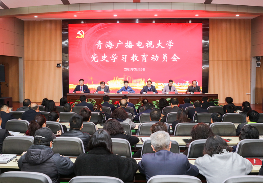 3月10 日,青海广播电视大学召开党史学习教育动员会,认真传达学习习近平总书记在党史学习教育动员大会、参加青海代表团审议、看望参加政协会议的医药卫生界教育界委员时的重要讲话精神,认真落实青海省委书记王建军在全省党史学习教育动员会上的讲话精神,安排部署学校党史学习教育各项工作。党委书记、党史学习教育领导小组组长庞晓玲作动员讲话,党委副书记、校长、党史教育领导小组副组长尚玛主持会议,党委班子成员、全体党员和党外教职工代表参加动员会。