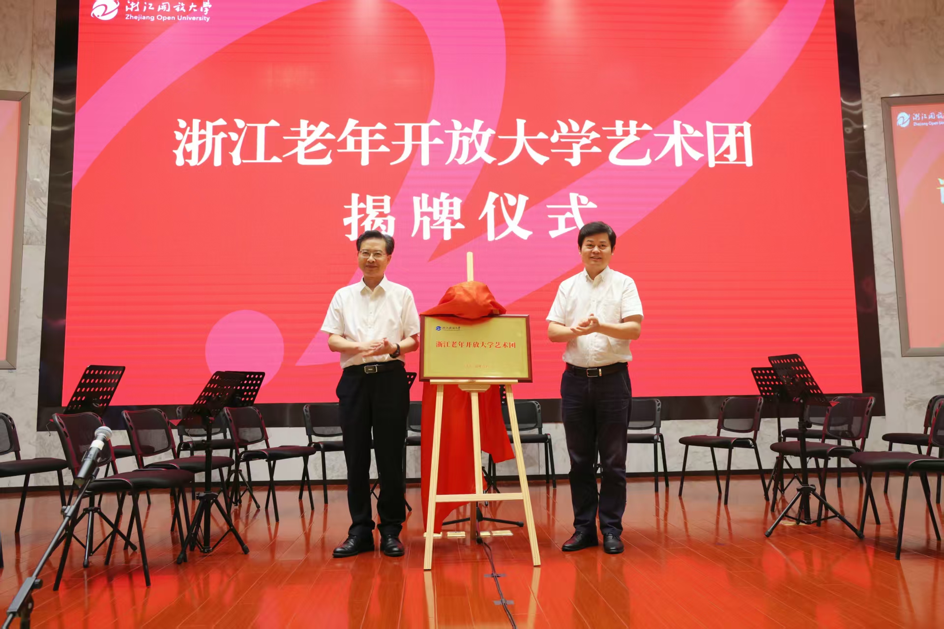活动现场,卢群星、张建国共同为浙江老年开放大学艺术团揭牌。