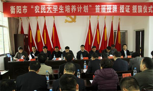 11月9日,衡阳市委组织部与衡阳电大在衡山县开云镇山竹村开展了“农民大学生培养计划”“教学实践与创业基地”授牌、“土专家、田秀才”授证、志愿服务者授旗活动。