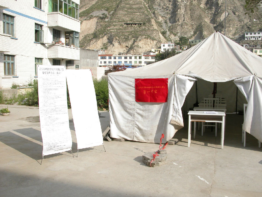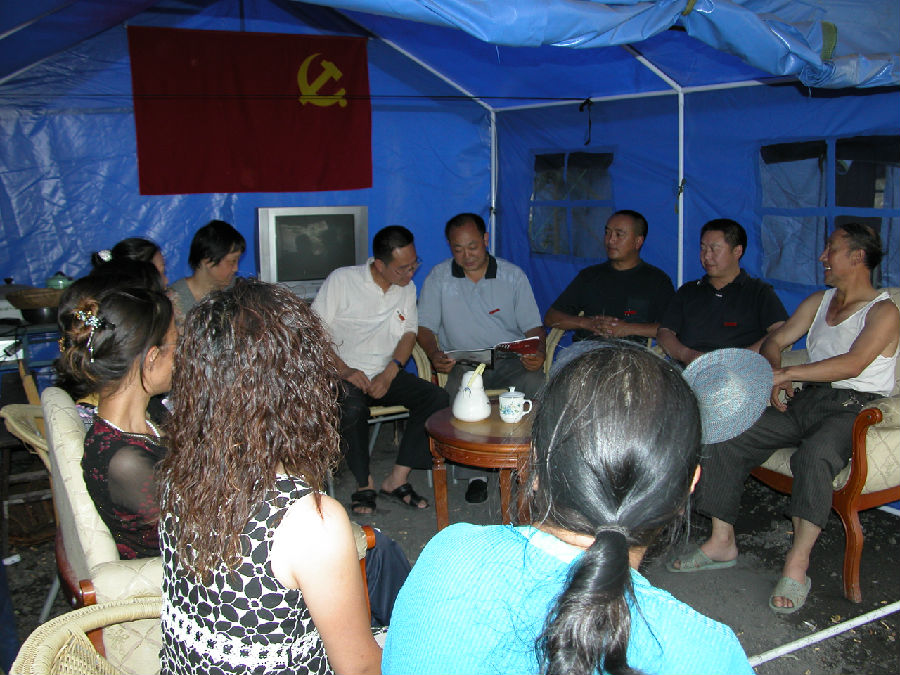 2008年7月1日,抗震救灾期间,阿坝电大党员干部在帐篷中开展主题党日活动。