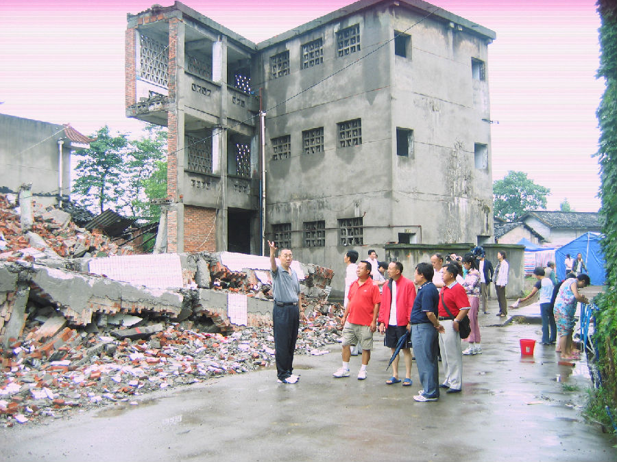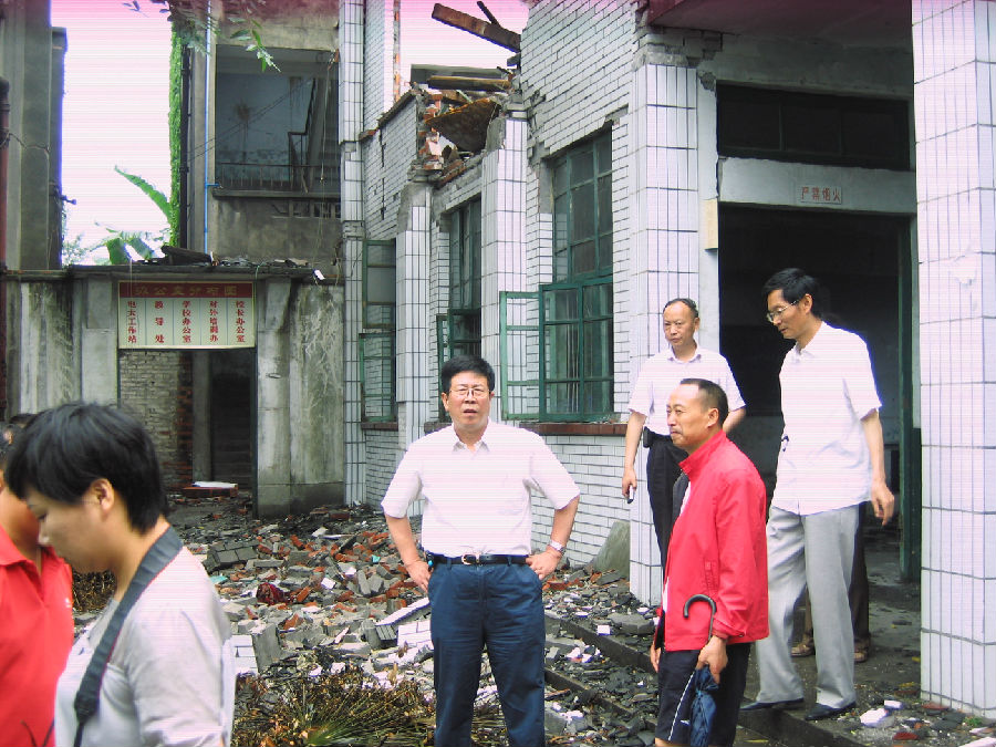 2008年6月,时任中央电大党委书记阮智勇(中)冒着余震危险赴德阳电大绵竹分校指导抗震救灾工作。