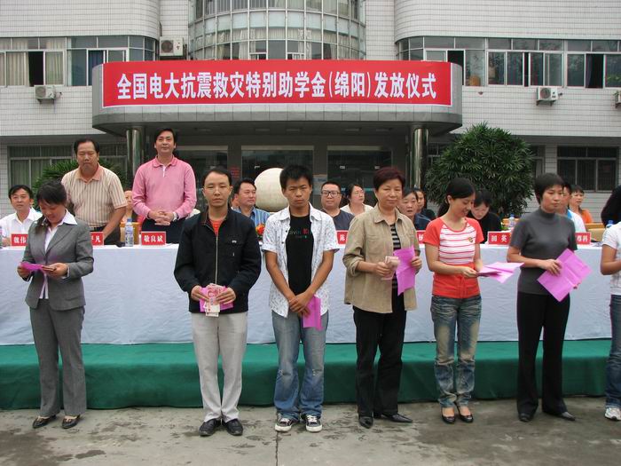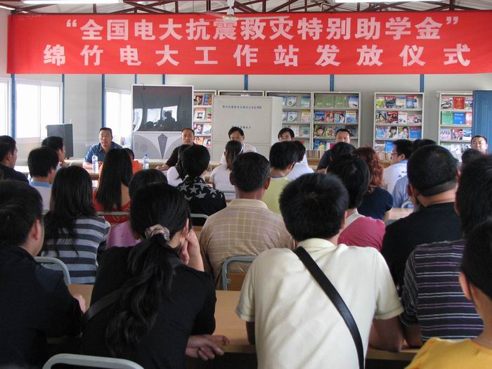 2008年8月,四川广播电视大学划拨专款110万元,为受灾较重的电大学员每人发放了500-1000元不等的特别助学金。左图为绵阳电大发放现场,右图为德阳电大绵竹分校发放现场