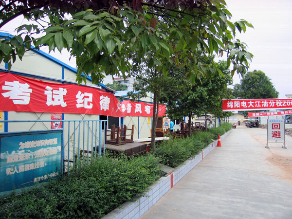 2008年7月,绵阳电大江油分校学生期末考试在板房平安进行。