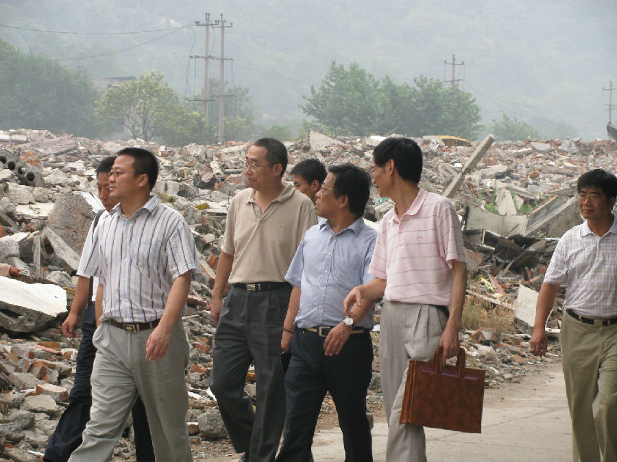 2008年8月,时任中央电大校长葛道凯(左三)在四川电大党委书记、校长杜幼文等陪同下赴绵阳、广元及青川等地受灾电大指导灾后复学工作。