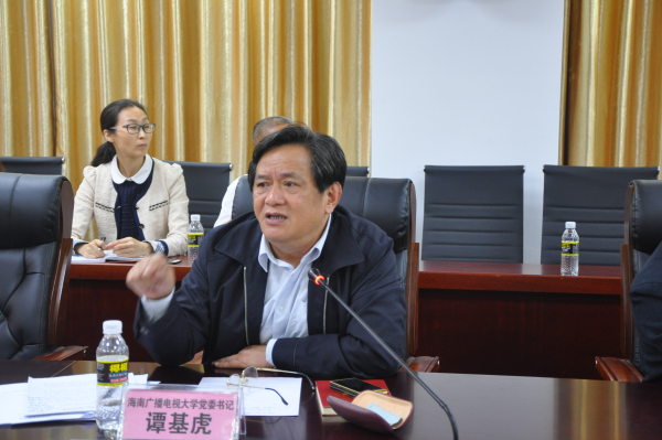 海南省脱贫致富电视夜校办公室设在海南电大。4月8日下午,采访团来到海南电大,实地考察了电视夜校961017服务热线工作情况并展开座谈。海南电大党委书记、省脱贫致富电视夜校办公室主任谭基虎,省扶贫办副巡视员王远玉,海南电大校长温强、副校长张君玉,省委组织部、海南电信公司、海南电视台及夜校办相关人员参加座谈。