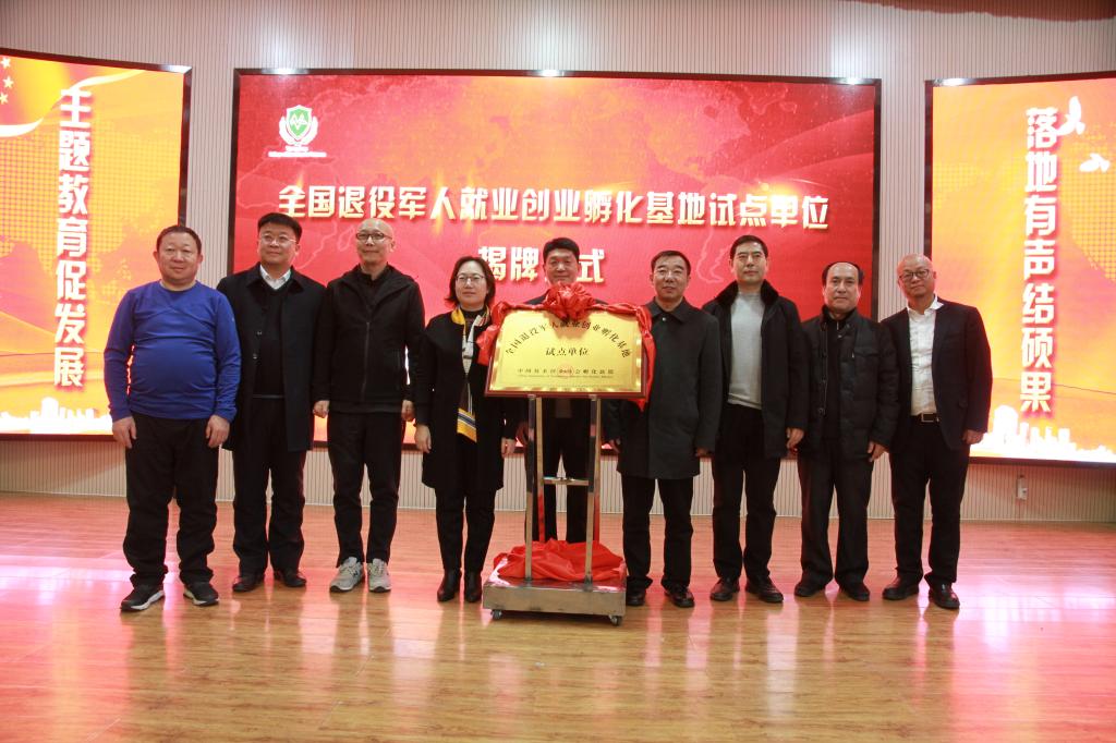 唐山市教育局局长刘绍辉、中国技术创业协会孵化联盟秘书长王晓利为全国退役军人就业创业孵化基地试点单位揭牌。