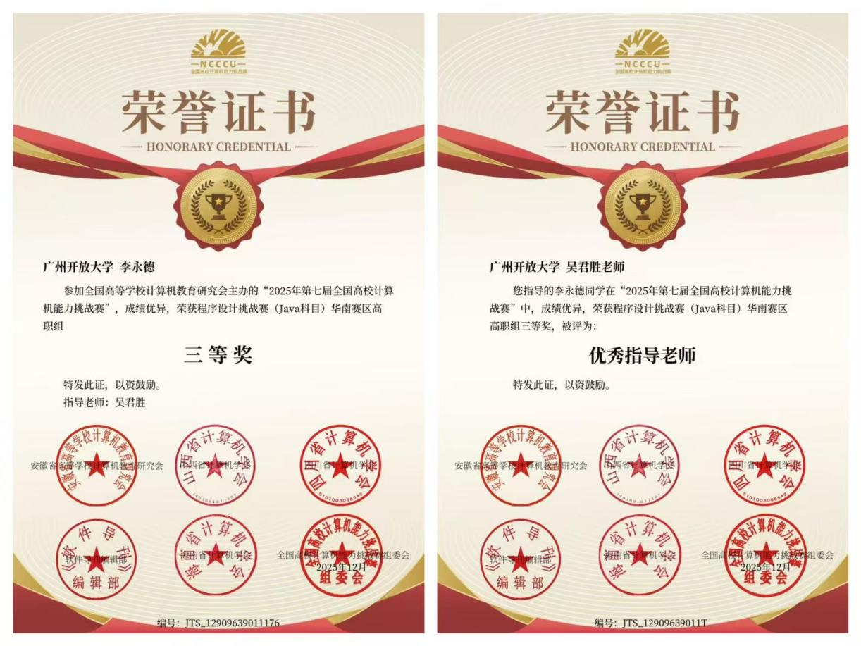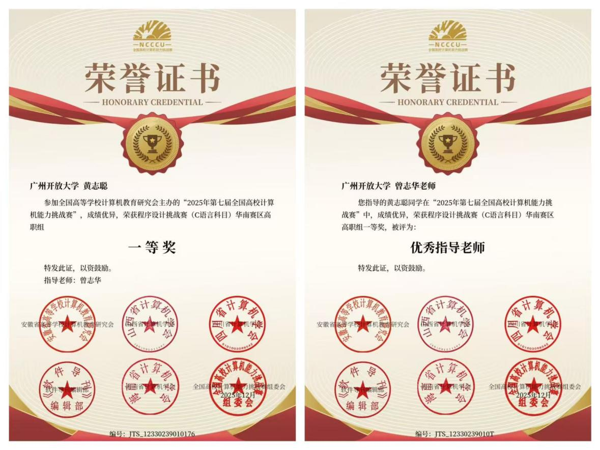 近日,第七届全国高校计算机能力挑战赛华南赛区赛事结果公布。广州开放大学师生在此次比赛中斩获 2 项一等奖、1 项三等奖,同时摘得优秀指导教师荣誉。其中,教学中心曾志华老师指导的黄志聪同学荣获 C 语言科目与 Java 科目高职组双料一等奖;吴君胜老师指导的李永德同学荣获 Java 科目高职组三等奖。两位指导教师均被授予“优秀指导老师” 称号。