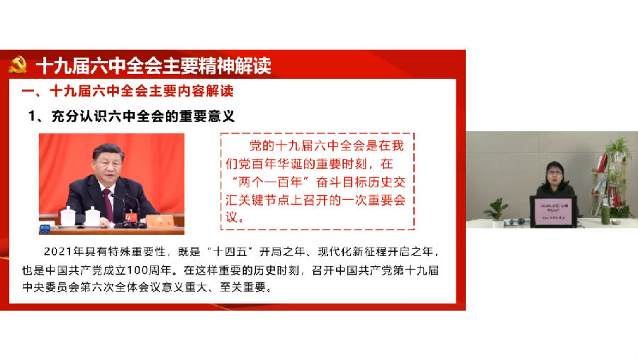 赵丽玲以《开启新征程 奋进新时代——十九届六中全会主要精神解读》为题,从十九届六中全会重要内容、开放大学学生勇担使命责任、落实“三全育人”深化教学改革三方面,为全校师生深刻阐明了十九届六中全会的重要意义和《中共中央关于党的百年奋斗重大成就和历史经验的决议》主要内容,对“两个确立”、马克思主义中国化的三次飞跃、十个坚持的宝贵历史经验、百年历程创造的伟大成就等内容进行了深入解读,使全校师生进一步明确了六中全会决议是一篇马克思主义的纲领性文件,是新时代中国共产党人牢记初心使命、坚持和发展中国特色社会主义的政治宣言,是以史为鉴、开创未来,实现中华民族伟大复兴的行动指南。