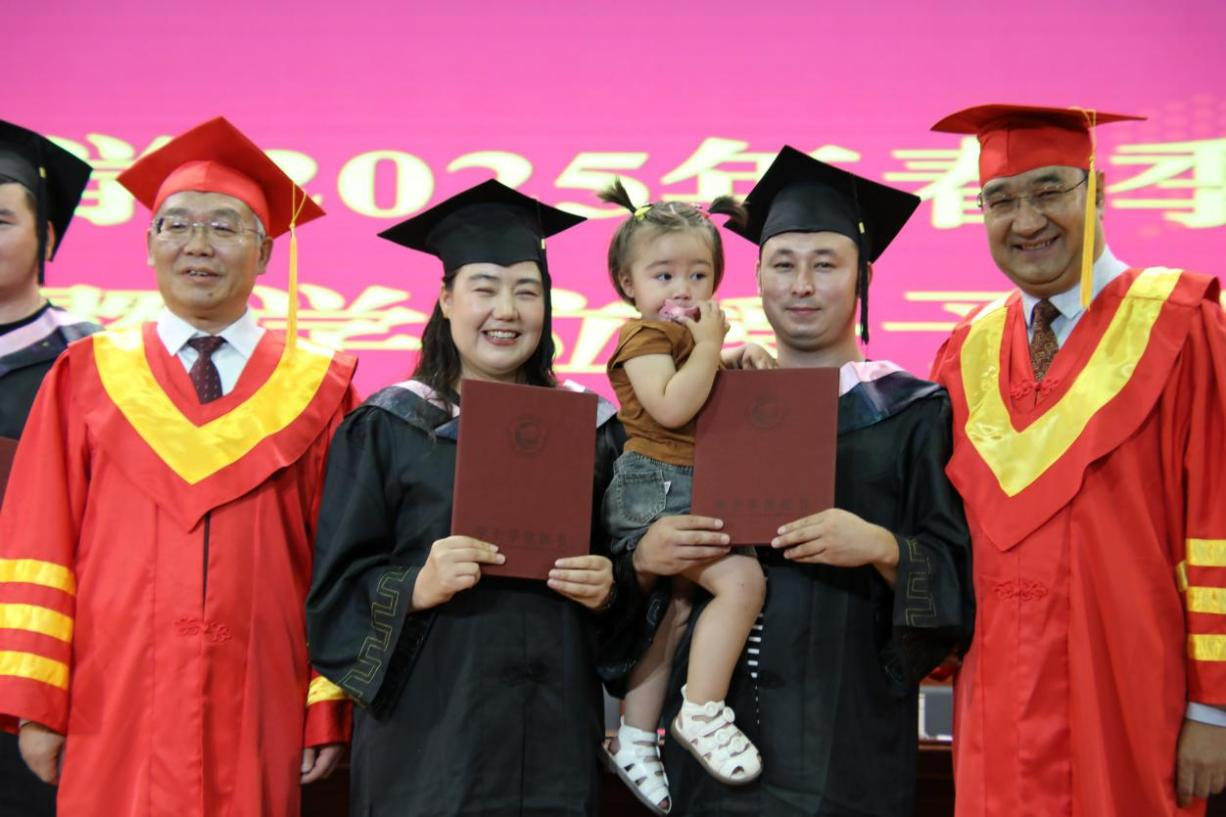 2025年6月28日,新疆开放大学2025年春季学生毕业典礼期间,学校党委书记张旭辉和学校党委副书记、校长安瓦尔·买买提明为毕业生夫妻夏克热·塔衣尔和妻子米呢瓦尔·湖达拜尔地颁发毕业证书