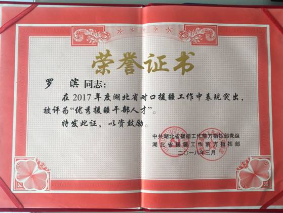 2018年3月,武汉电大援疆工作得到湖北省援疆工作前方指挥部党组、湖北省援疆工作前方指挥部好评,信息中心(武汉远程教育中心)教师罗滨被授予“优秀援疆干部人才”称号。