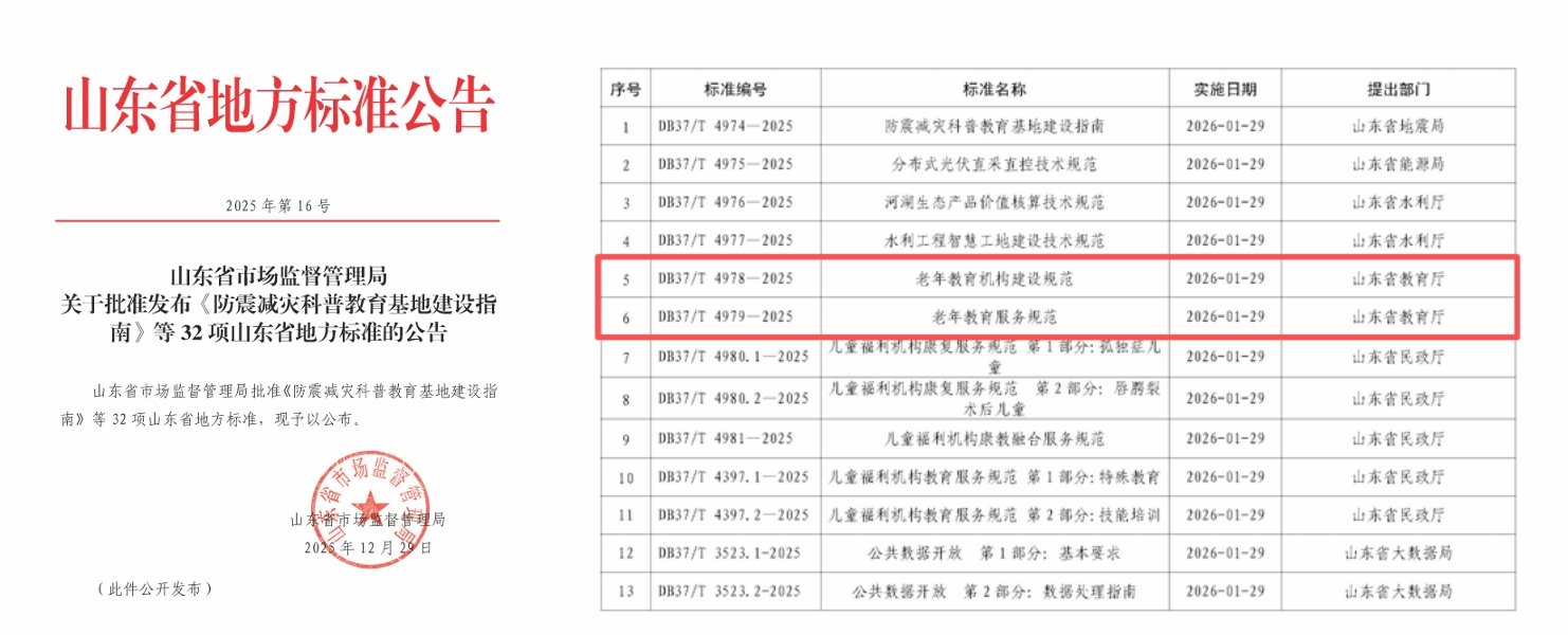 12月29日,山东省市场监督管理局发布公告,正式批准发布《老年教育机构建设规范》《老年教育服务规范》两项山东省地方标准。这是山东省首次针对老年教育领域制定的地方标准,学校作为主要起草单位之一,全程主导并深度参与了标准的调研、起草与论证工作,为标准的科学性与实用性提供了关键支撑。