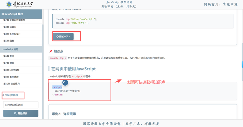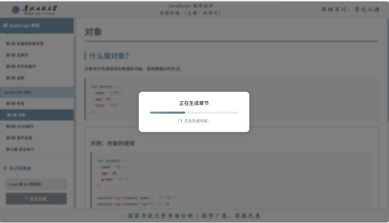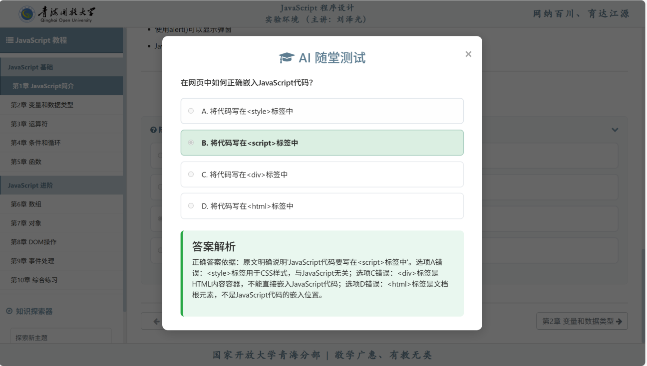 针对传统教学软件普遍存在“交互路径单一、资源预设固定”的局限,青海分部立足“JavaScript程序设计”课程的强实践属性,探索“场景化+嵌入式”教学新模式。平台着力突破传统静态资源限制,践行“以学习者为中心”的教学理念。借助AI技术,尝试实现教学内容随需生成、练习题目随学随配,努力将智能技术从单一的辅助工具转变为嵌入“教、学、练、测”全流程的智慧学伴,让技术服务于深度的学科教学与人才培养需求。