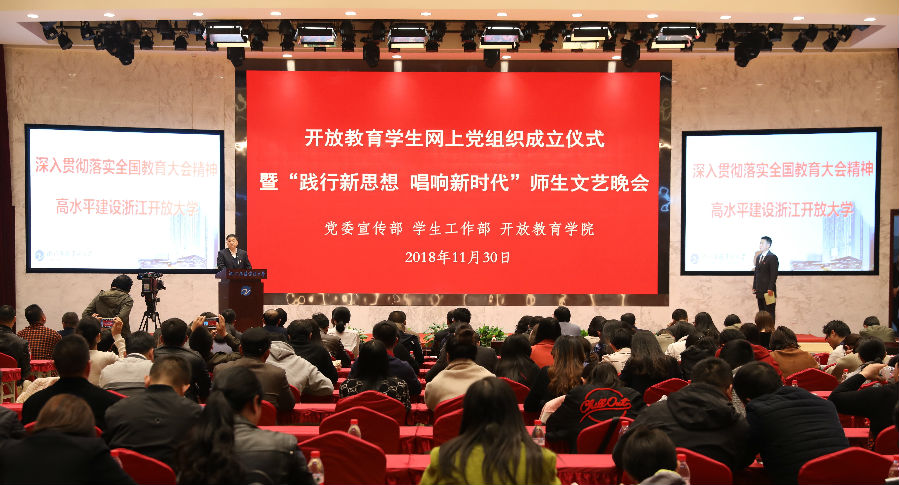 为深入贯彻落实习近平新时代中国特色社会主义思想和全国教育大会、高校思想政治工作会议精神,11月30日,浙江电大举行开放教育学生网上党组织成立仪式暨“践行新思想 唱响新时代”师生文艺晚会,学校领导班子和师生代表近200人参加活动。