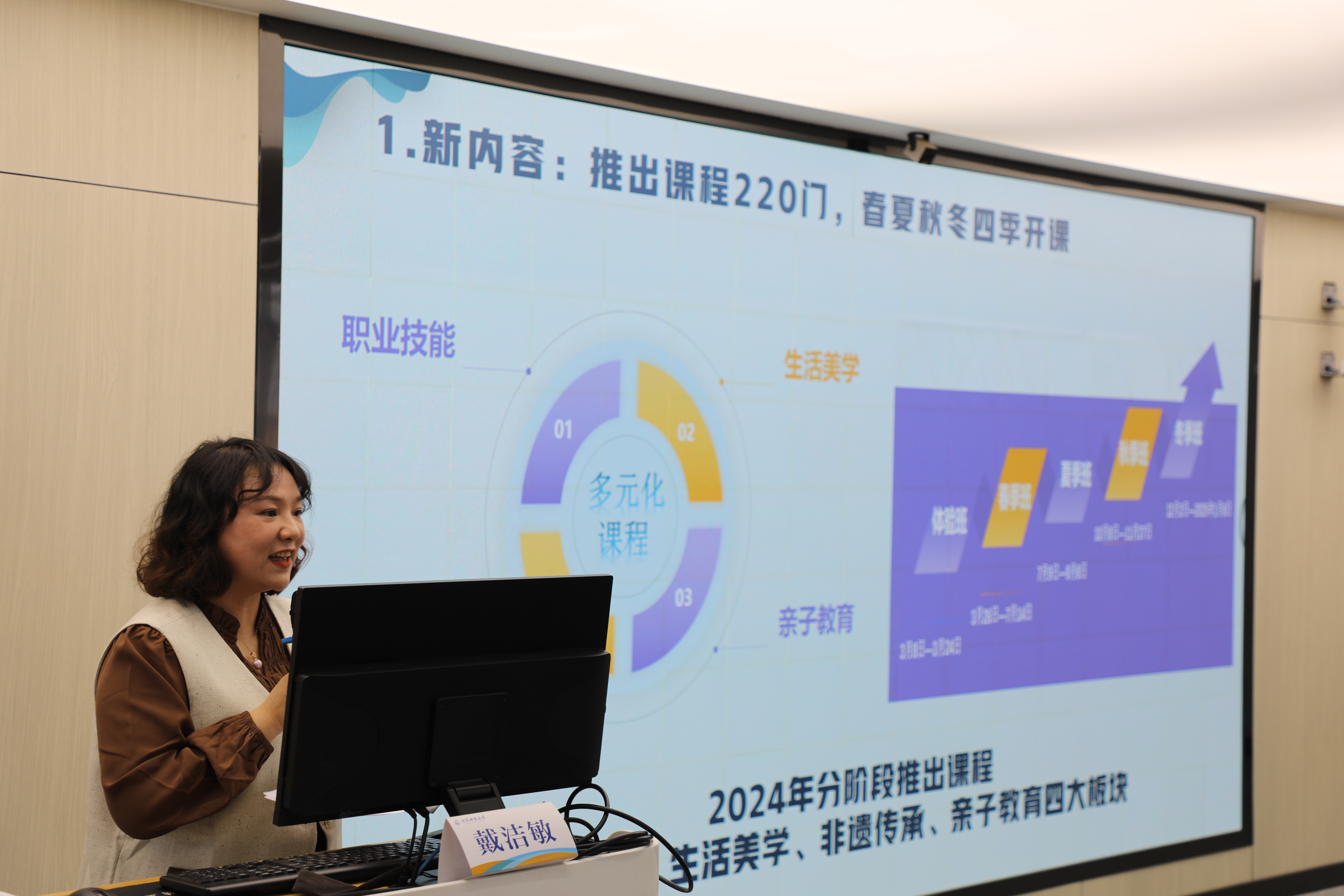 在研讨会第一个议程中,培训学院的戴洁敏院长介绍了市民夜校建设一年多来的成果和工作心得;市民夜校的李乐源老师、宁波大学的郑岳青教授、广电集团的孙文霞科长分别代表市民夜校的师生做了心得分享;来自宁波万科企业的张坤则代表合作企业谈到了市民夜校与万科的联姻之路,强调了品牌建设与市场需求相结合的重要性,希望不断深化资源共享、优势互补,共同推动终身学习品牌的发展。
