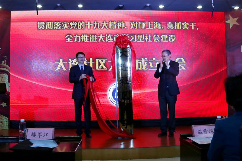 大连市教育局局长赵阳和大连电大党委书记于国喜为大连社区大学揭牌。