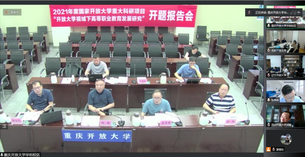 北京师范大学首都学习型社会研究院院长张伟远教授、重庆市高教学会秘书长余志祥教授、江苏开放大学教育科学研究院院长纪河教授、重庆开放大学科研处处长郭兵教授及质量办副主任沈铁松教授担任开题评议专家。总项目和五个子项目负责人及成员,以及科研处相关人员出席报告会,国家开放大学科研处处长陈守刚在线参会指导。