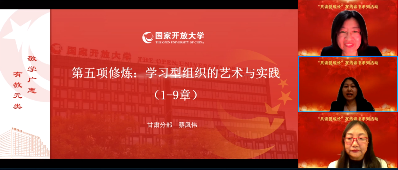 当日,在国家开放大学“办学体系教师共读书”第七场活动中,甘肃开放大学教师蔡凤伟受邀担任活动的分享嘉宾,为书籍《第五项修炼:学习型组织的艺术与实践》做主题分享,与全国办学体系教师交流读书心得、共享学习成果。