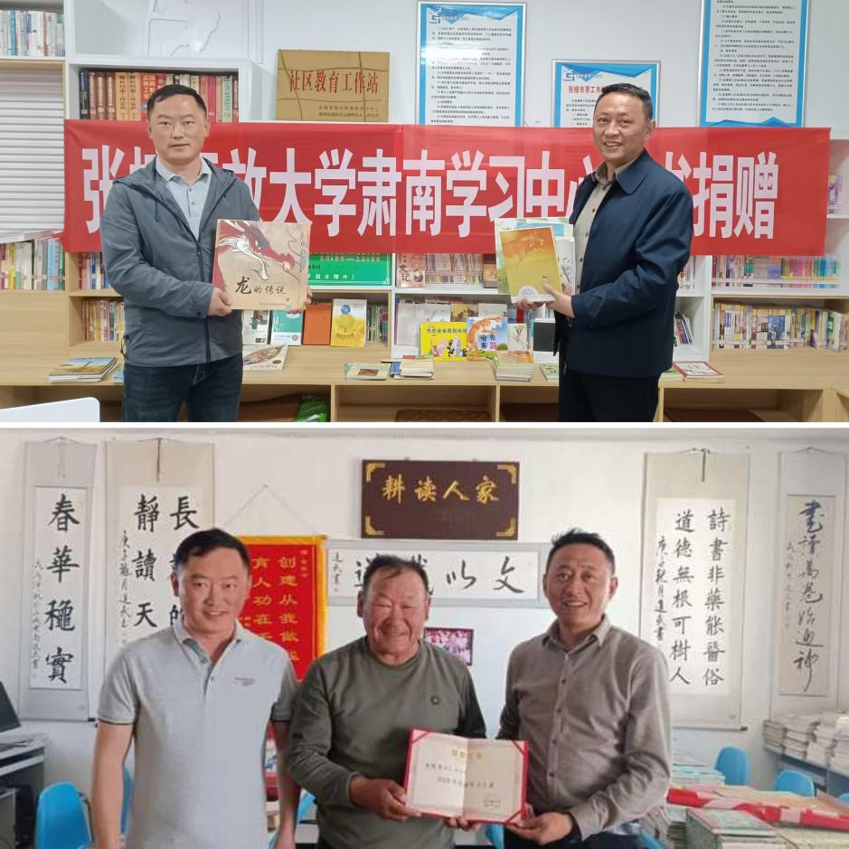 张掖开放大学肃南学习中心积极响应全市“阅享新时代·共绘新图景”全民阅读宣传周活动号召,组织学习中心教师赴肃南县明花乡开展“明花乡社区教育工作站挂牌暨图书捐赠”活动,并驱车赴明花乡莲花村,为全国十大读书人物安维智老人的尕牧什拉芜尔书屋捐赠了图书,送达了甘肃省2023年新时代“百姓学习之星”荣誉证书。