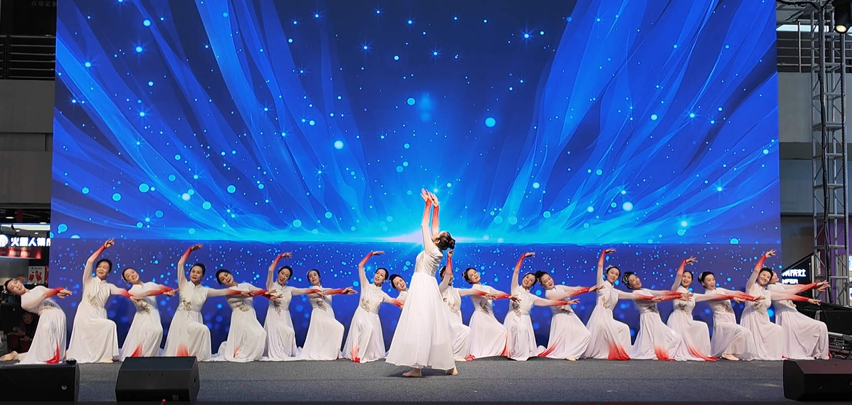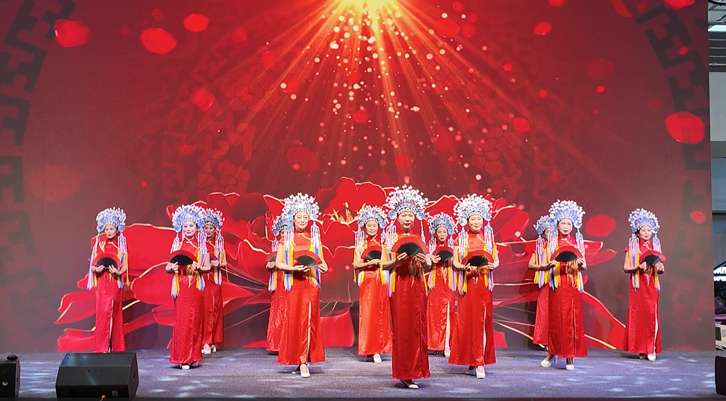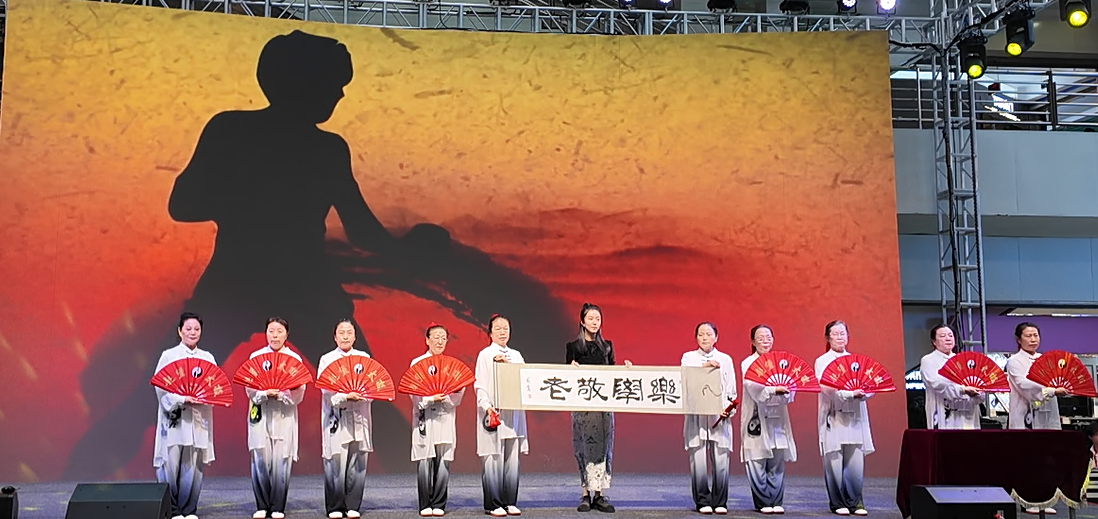 展演围绕“古韵流芳,礼敬传承”“爱满重阳,温情永续”“金色芳华,银龄生辉”三大篇章展开,节目涵盖太极扇、民族舞蹈、诗朗诵、非洲鼓、吉剧、汉服秀等多种形式,展现了丰富的艺术修养与积极的生活态度。活动中“敬菊花茶献重阳糕”互动环节尤为暖心,身着汉服的工作人员向70岁以上长辈奉上菊花茶与重阳糕,将尊老敬老之情化为温暖行动,深化了“乐学敬老”的主题内涵。