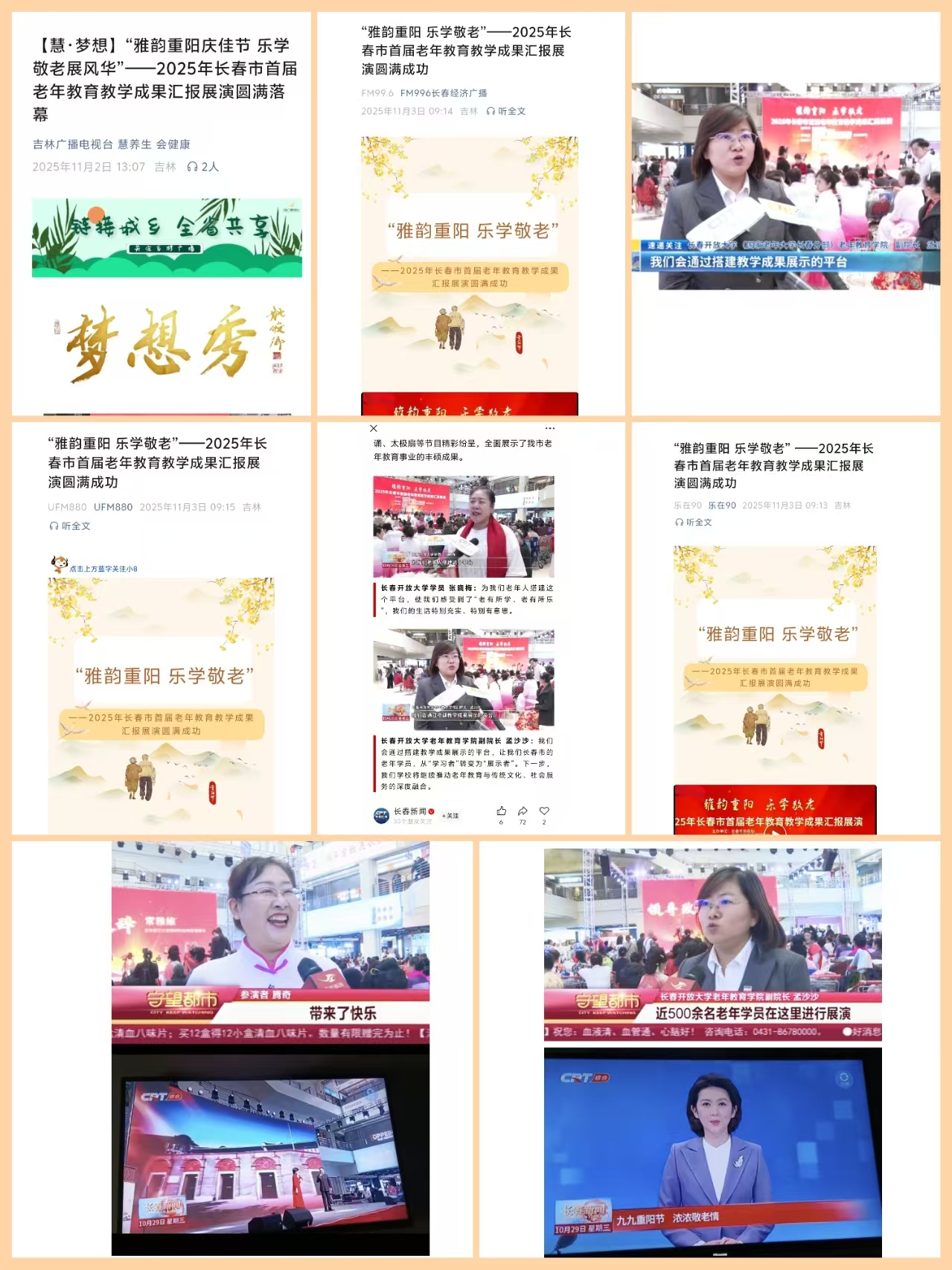 吉林广播电视台、长春新闻、守望都市、长春广播电视台三个频道、城市速递等7家媒体深度聚焦、全程跟进,通过多平台、多时段传播;同时,长春开放大学(国家老年大学长春分部)视频号、抖音、快手三个平台同步直播,线上观看人数达4576人,点赞量突破3.2万,形成立体化传播声势,有效提升了活动影响力与社会参与度。