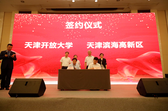 刘金明、陈进红分别代表天津开放大学和滨海高新区签署全面战略合作协议。