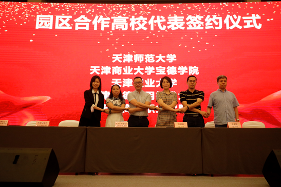 天津开放大学跨境电商学院院长平凡作为产业园运营代表与天津师范大学等九所高等院校签署共建实训基地合作协议。