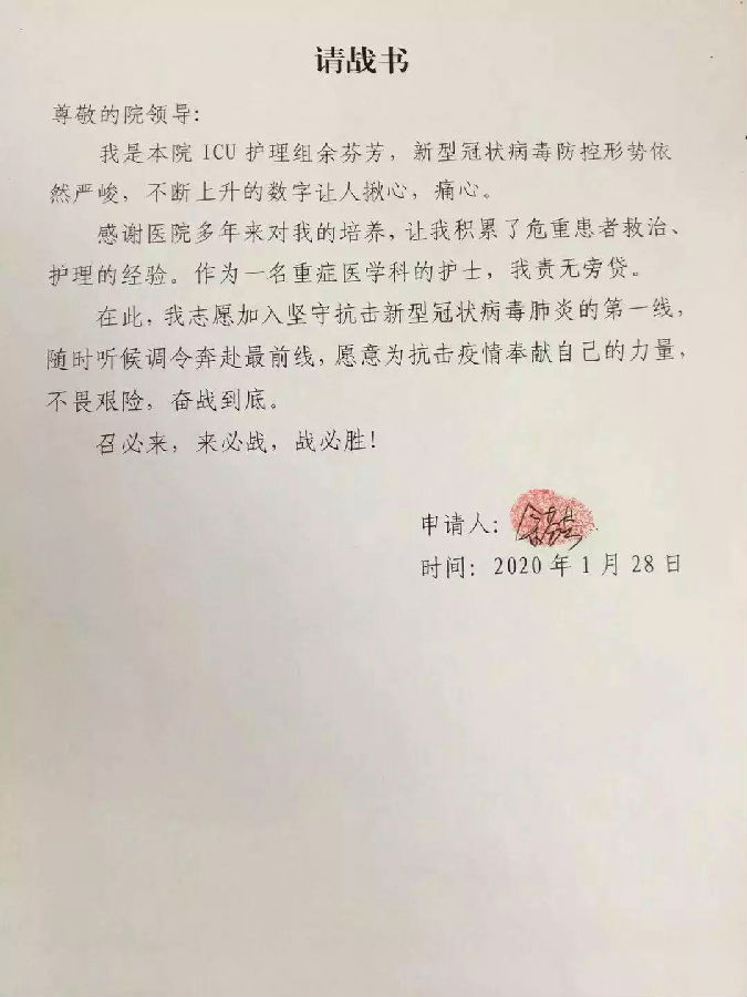 余芬芳,女,1995年1月生,国家开放大学2019春专科学生,勤奋好学,成绩优异。1月28日写下援鄂请战书。